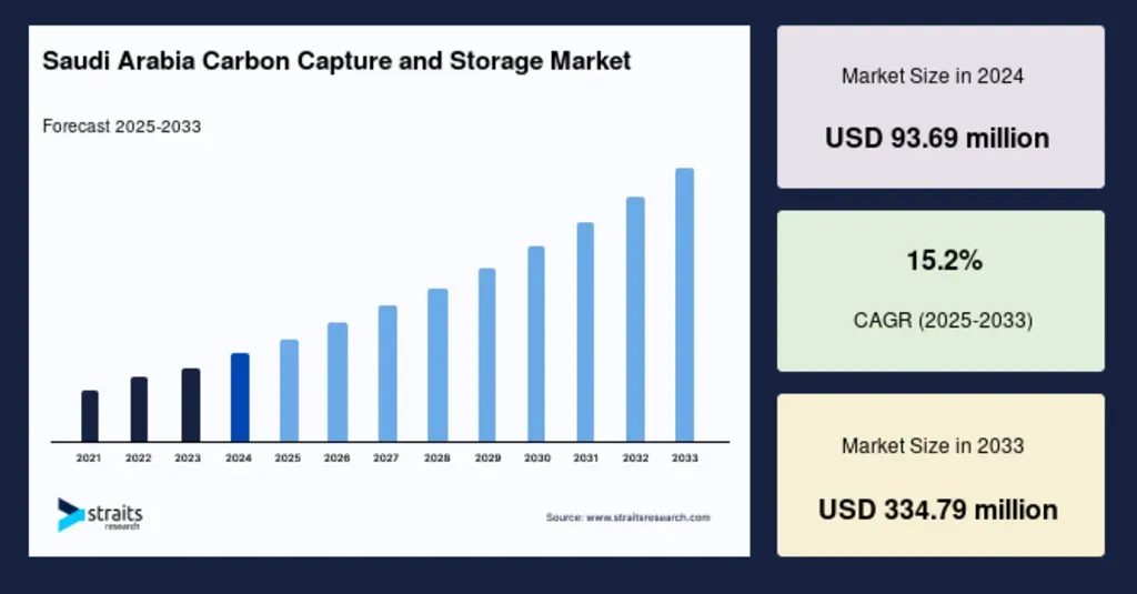 The Saudi CCS & Hydrogen Tech Market is growing fast, starting at $107.93 million in 2025 and expected to reach $334.79 million by 2033. That’s a 15.2% annual growth rate. Behind those numbers is a bigger story: the Kingdom is turning carbon from a problem into a resource.